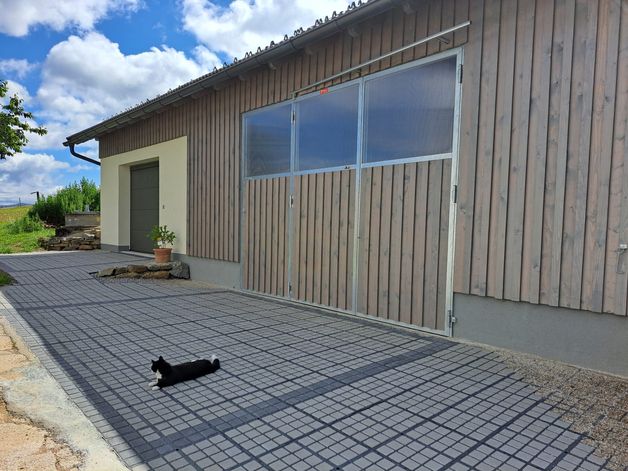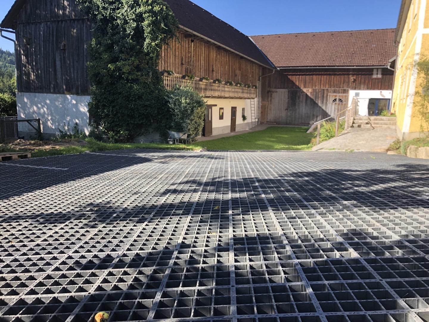 Wir haben nach super Beratung durch die Firma dieses Bodensystem rund um unsere 5 Heuraufen für Pferde verlegt. Fast keinen Unterbau gemacht (genau nach deren Empfehlung) und schaut super aus! Wir füllen das Heu mit dem Traktor nach und fahren daher regelm. über die Flächen - alles kein Problem. Auch zum Sauberhalten perfekt (wir machen das 1x wöchentlich mit einem Schild am Traktor). Planen heuer noch einen neuen Parkplatz für unseren Einstellbetrieb damit!