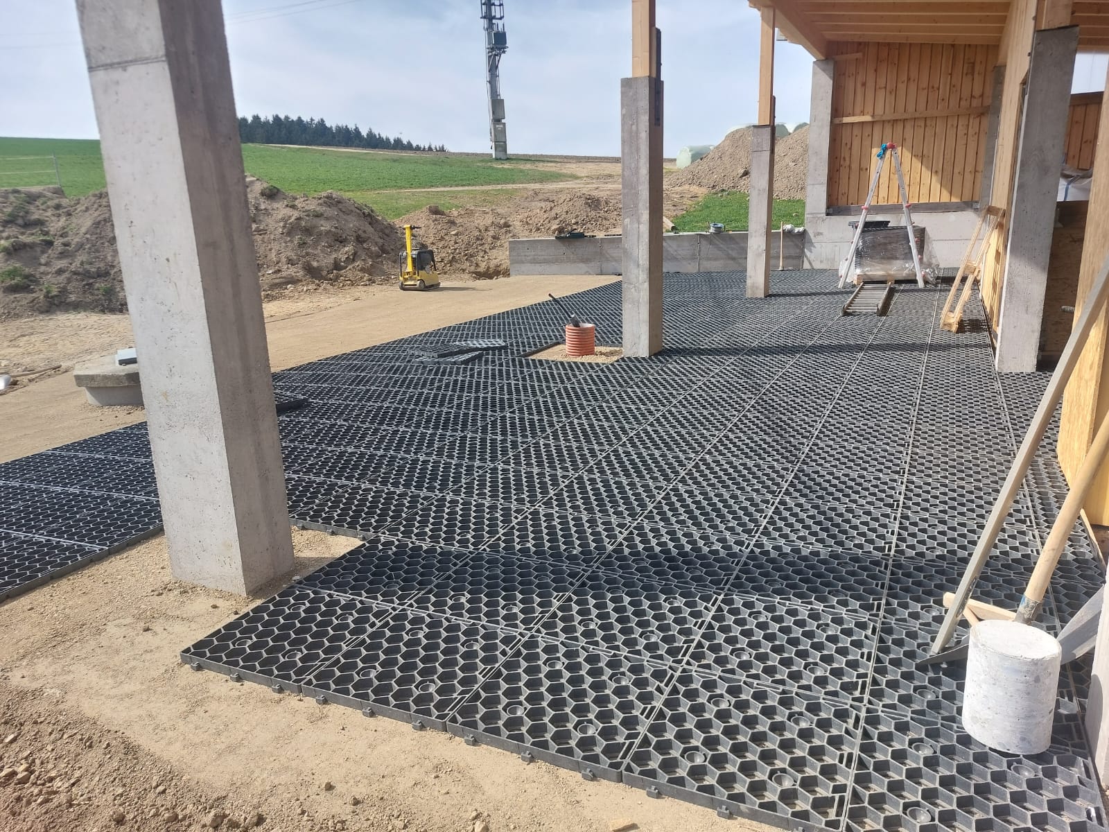 Wir haben einen Reitplatz mit der Paddockplatte FINN auf einer Fläche von 420 m² angelegt mit 4% Gefälle. Da wir keinen Schotter verwenden durften, (gepachtete Fläche) besteht unser Unterbau aus einer 10–15 cm Sandschicht, darüber ein Vlies, so wie es uns von Herrn Peter Großschartner empfohlen wurde.